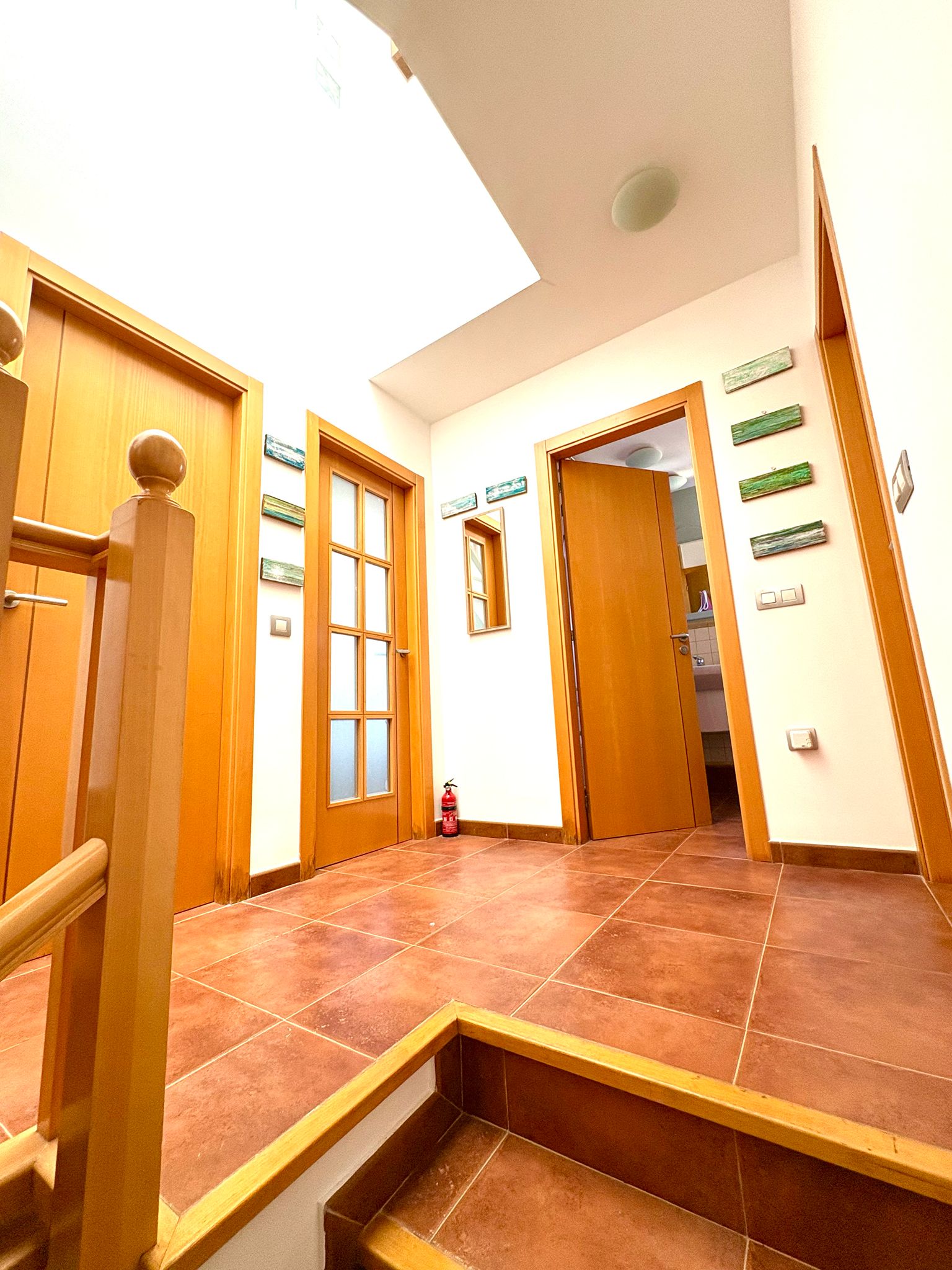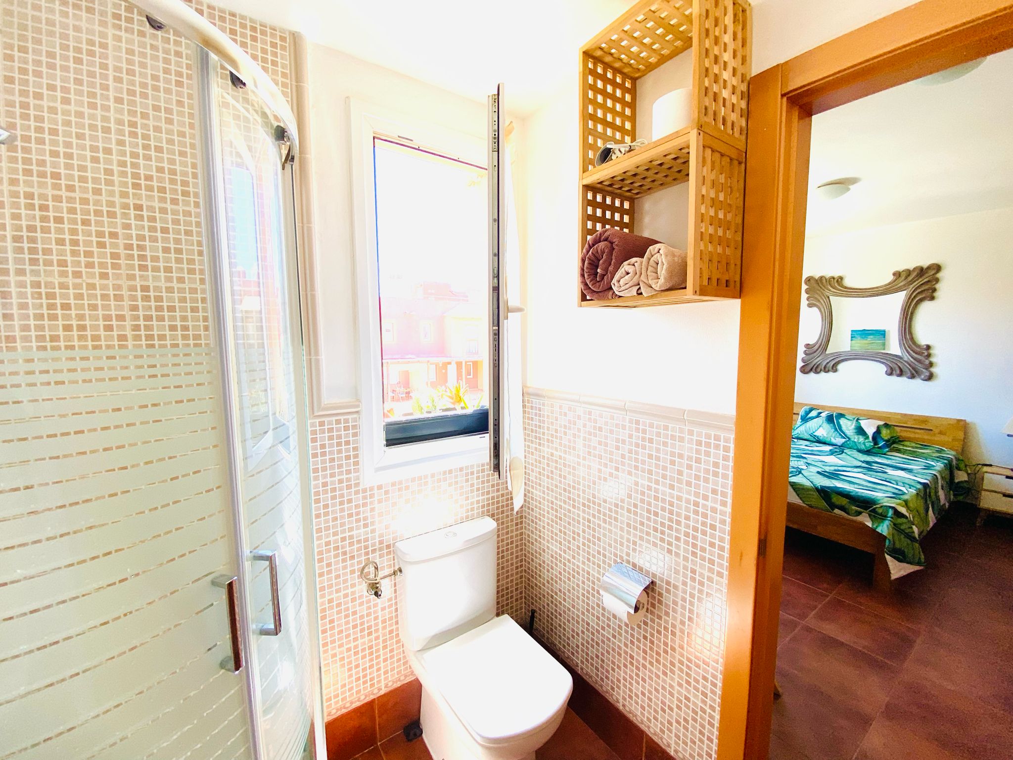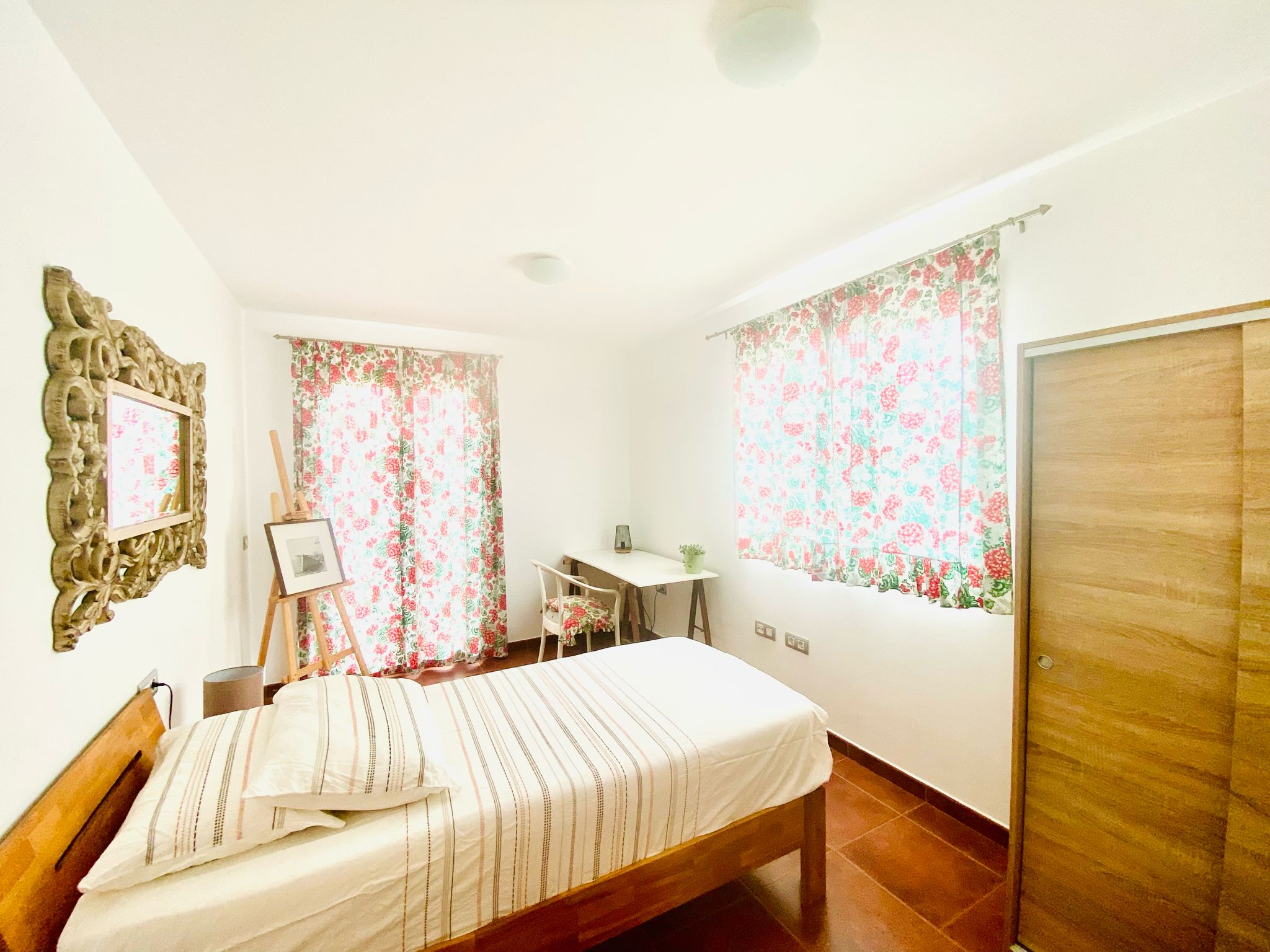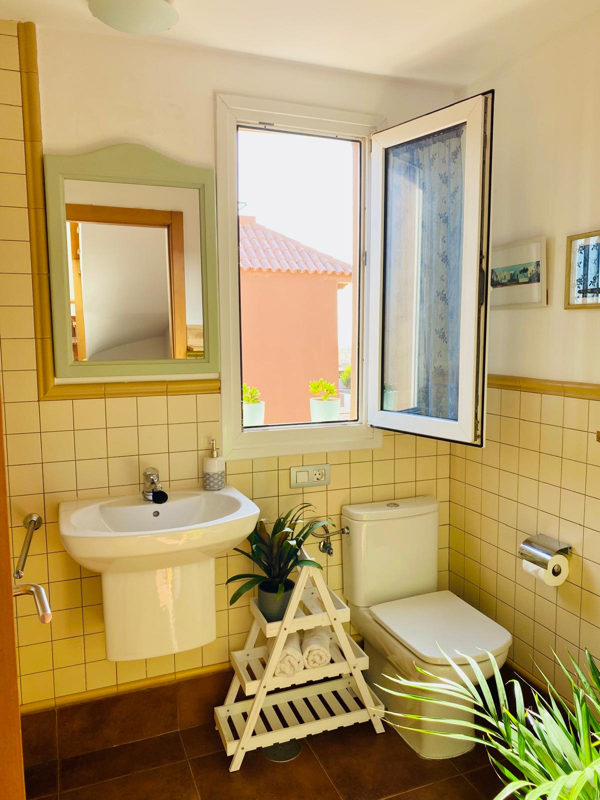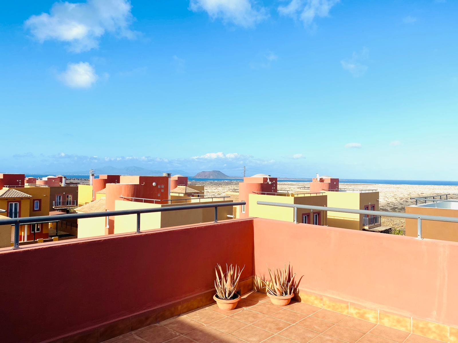 En la planta alta, encontrarás tres amplios dormitorios que garantizan descanso y privacidad, además de dos baños completos, uno de ellos ensuite en el dormitorio principal. Este espacio cuenta con un amplio armario empotrado y acceso a una azotea privada con vistas espectaculares sobre el parque de las dunas e isla de Lobos. Imagina disfrutar de atardeceres inolvidables desde tu propio solárium.